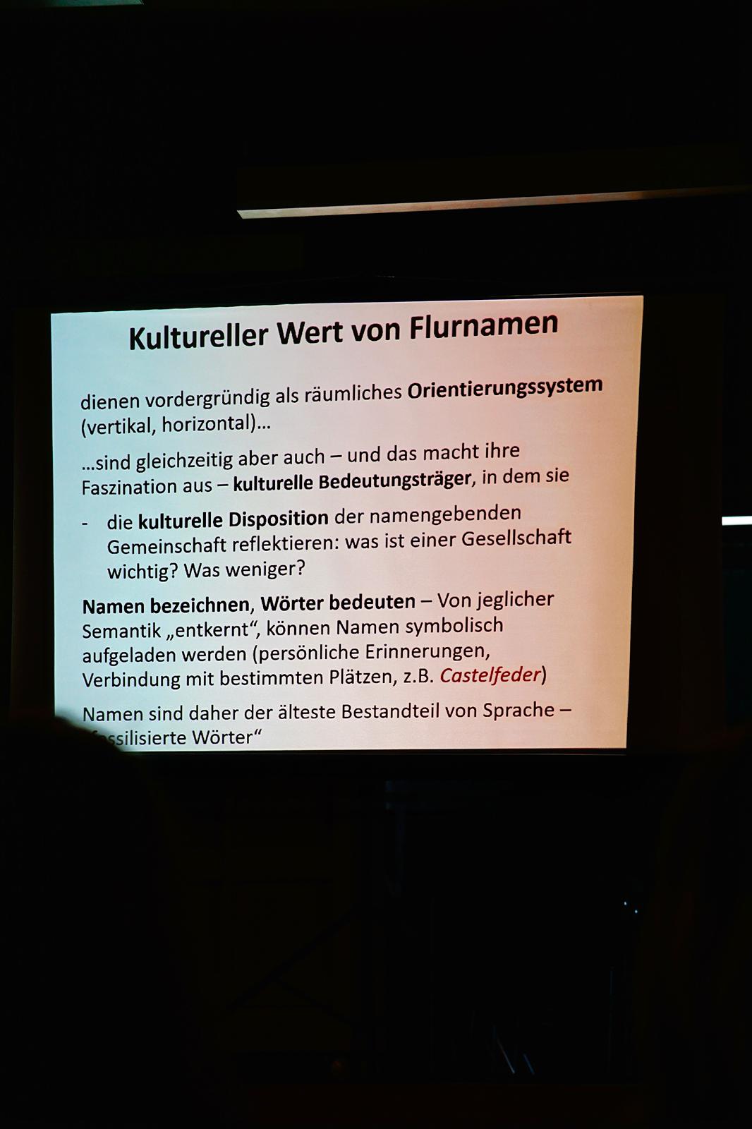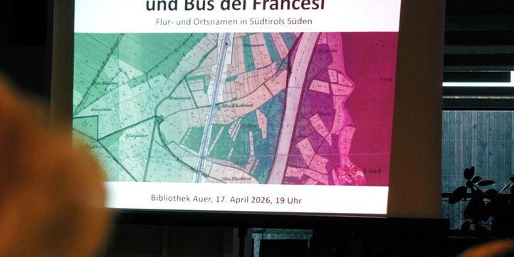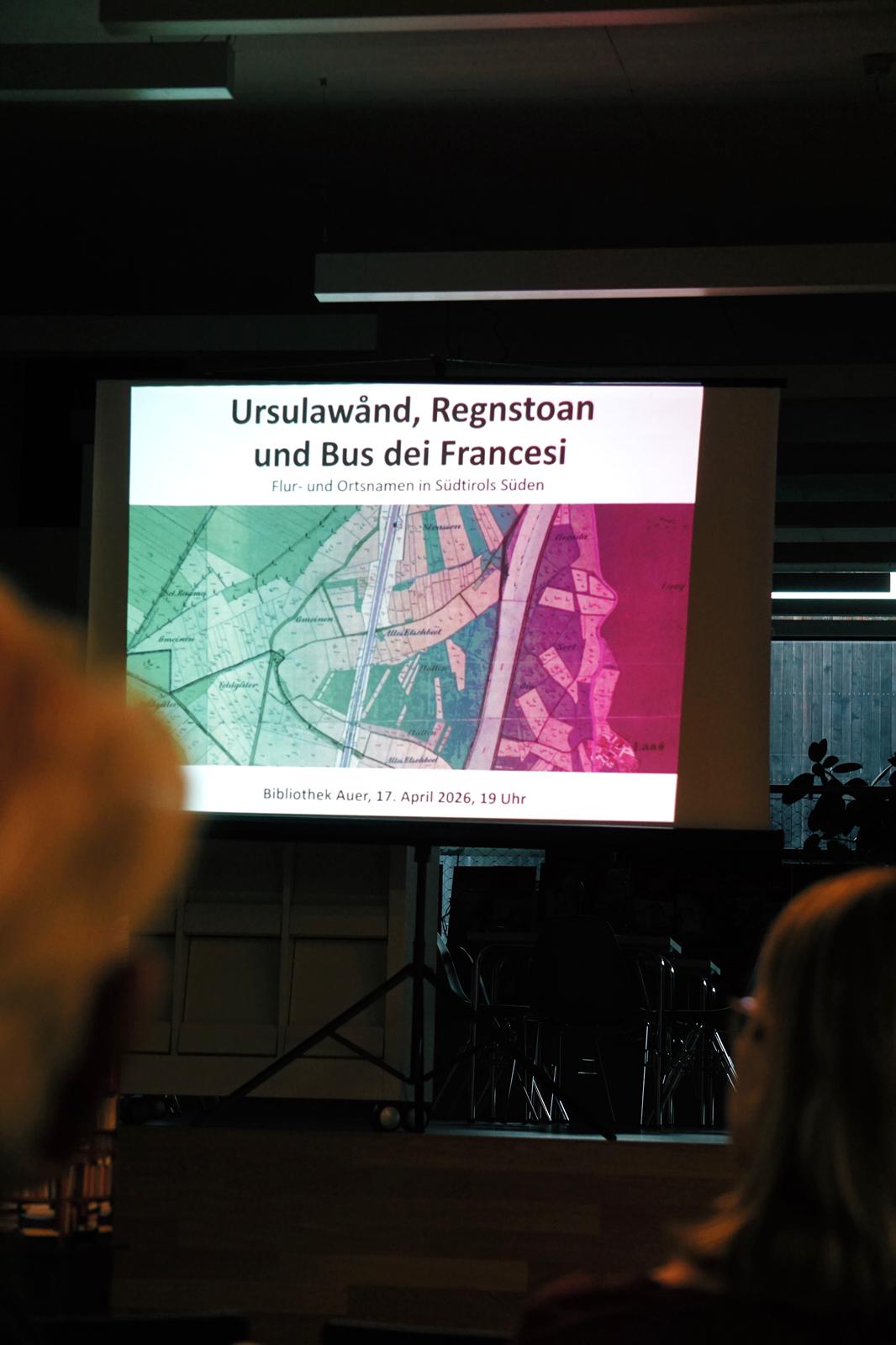 „Lafot, Bus dei Francesi, Fetzbründl, Onchirti, Cislon, Afghanistan, Madrutt, Pragglasir, ....“ machen das Südtiroler Unterland reich an Flurnamen. Der bekannte Flurnamenforscher Johannes Ortner präsentierte in der Öffentlichen Bibliothek Auer - in Zusammenarbbeit mit unserer Schulbibliothek - eine bunte Auswahl von alten, jungen, heiteren und erstaunlichen Flurnamen. Abgerundet wurde der Abend durch die Verkostung der Weine vom Happacherhof durch Kellermeister Thomas Mayr.