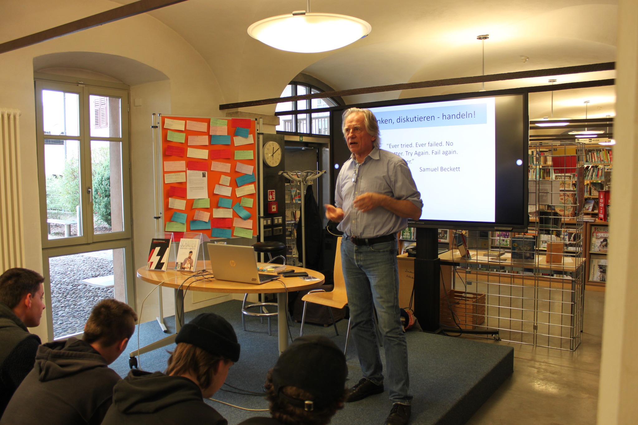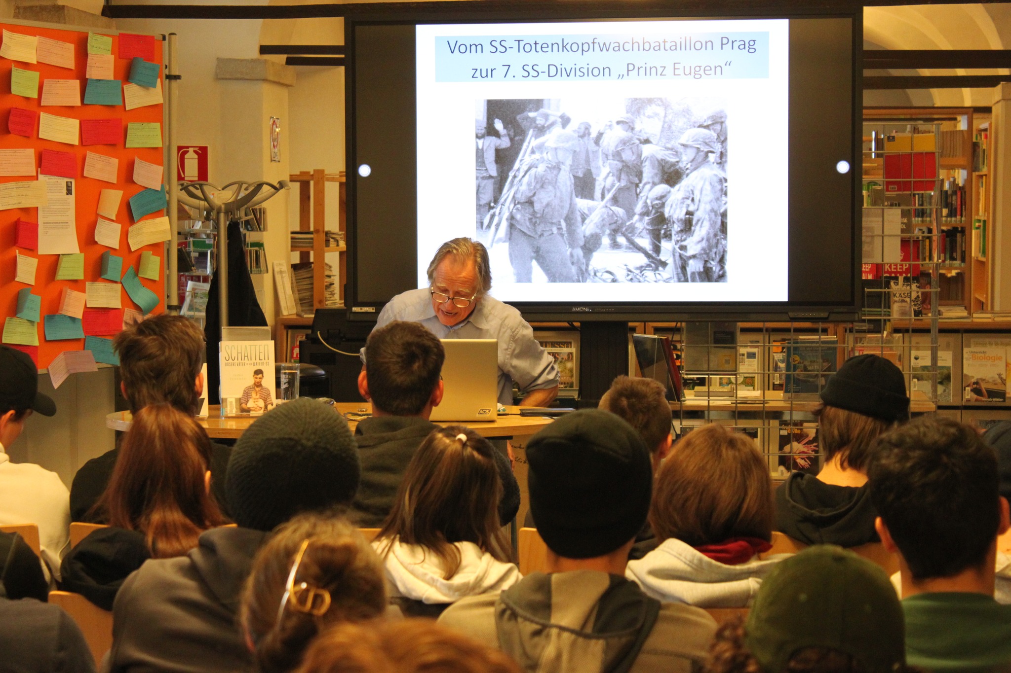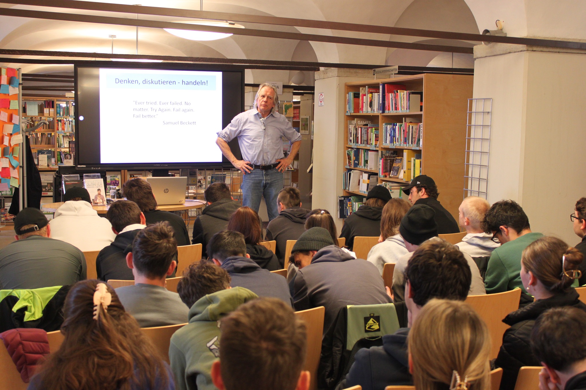 Der renommierte Politologe und Pädagoge Thomas Casagrande präsentierte den Klassen 5ALU und 5AWÖ seine neueste Publikation "Schatten. Unsere Väter in der Waffen-SS". Thomas Casagrande, selber Sohn eines Südtiroler SS-Offiziers, legte den Schüler*innen mit seiner eloquenten Art Ausschnitte der Gespräche mit den Söhnen, Töchtern und Enkeln von Südtiroler Angehörigen der Waffen-SS dar. Er schilderte die Ambivalenzen der Gefühle der Nachkommen, über ihre Erfahrungen mit Gewalt und die noch immer aktuellen Spuren der Geschichte, selbst 80 Jahre nach Kriegsende.