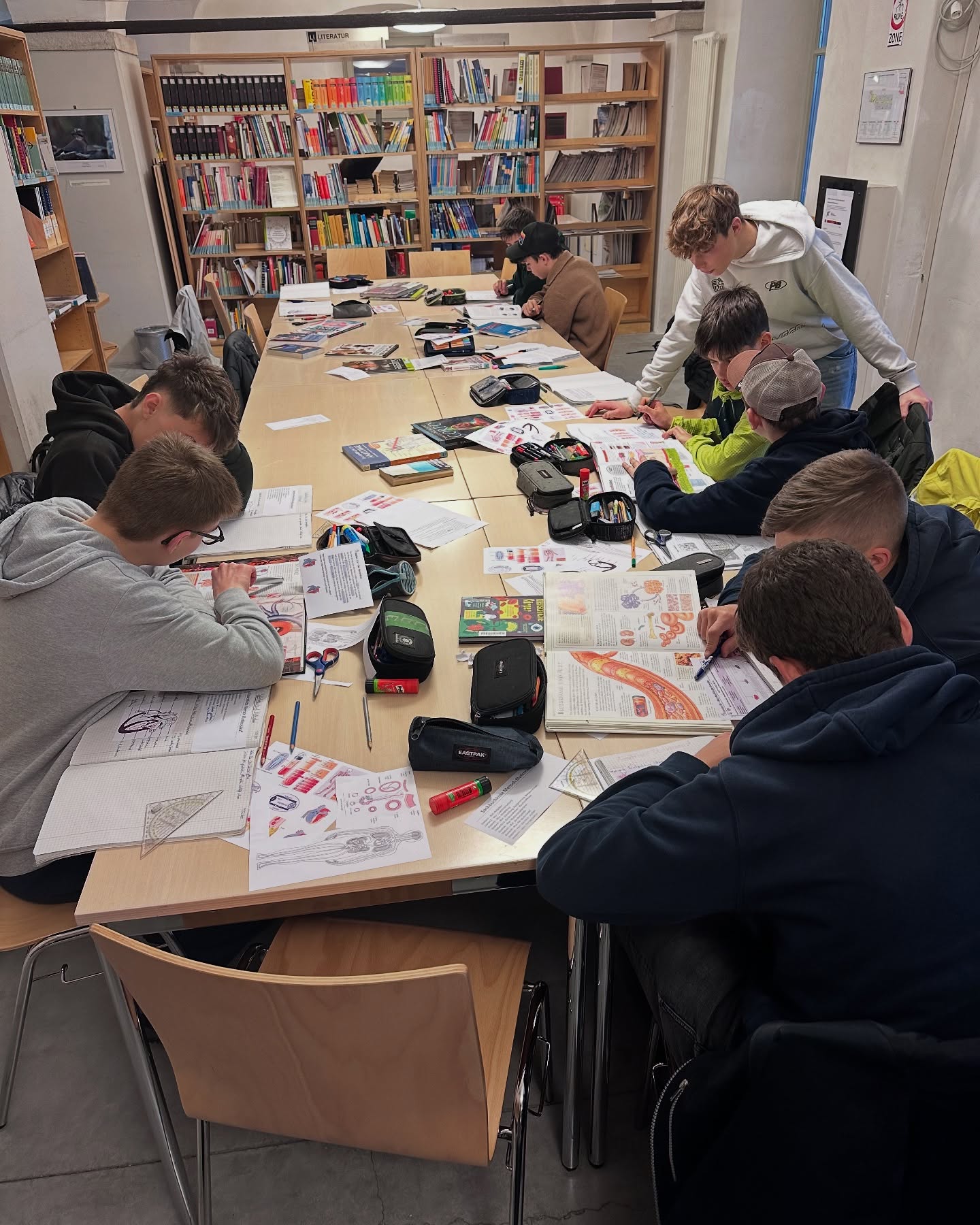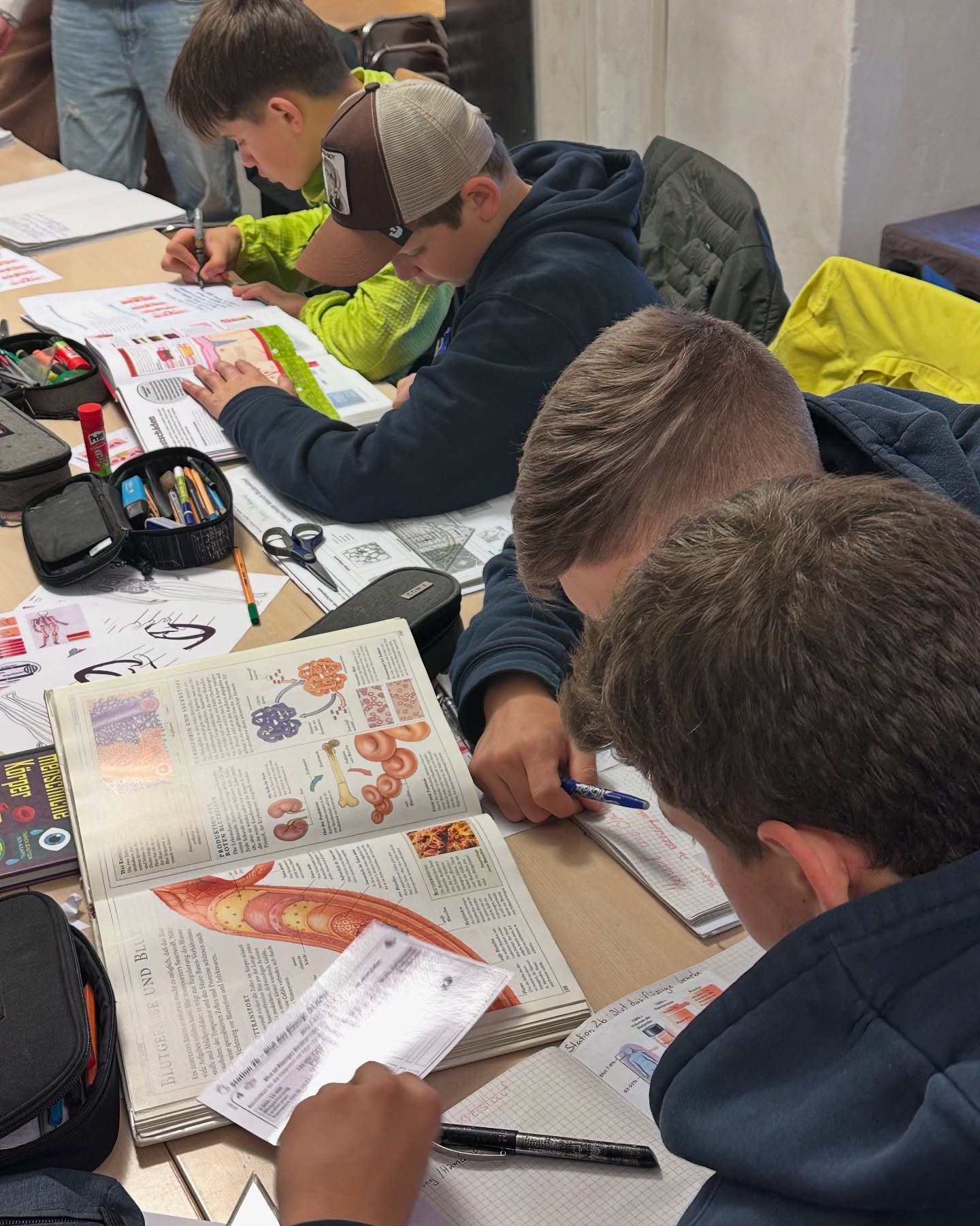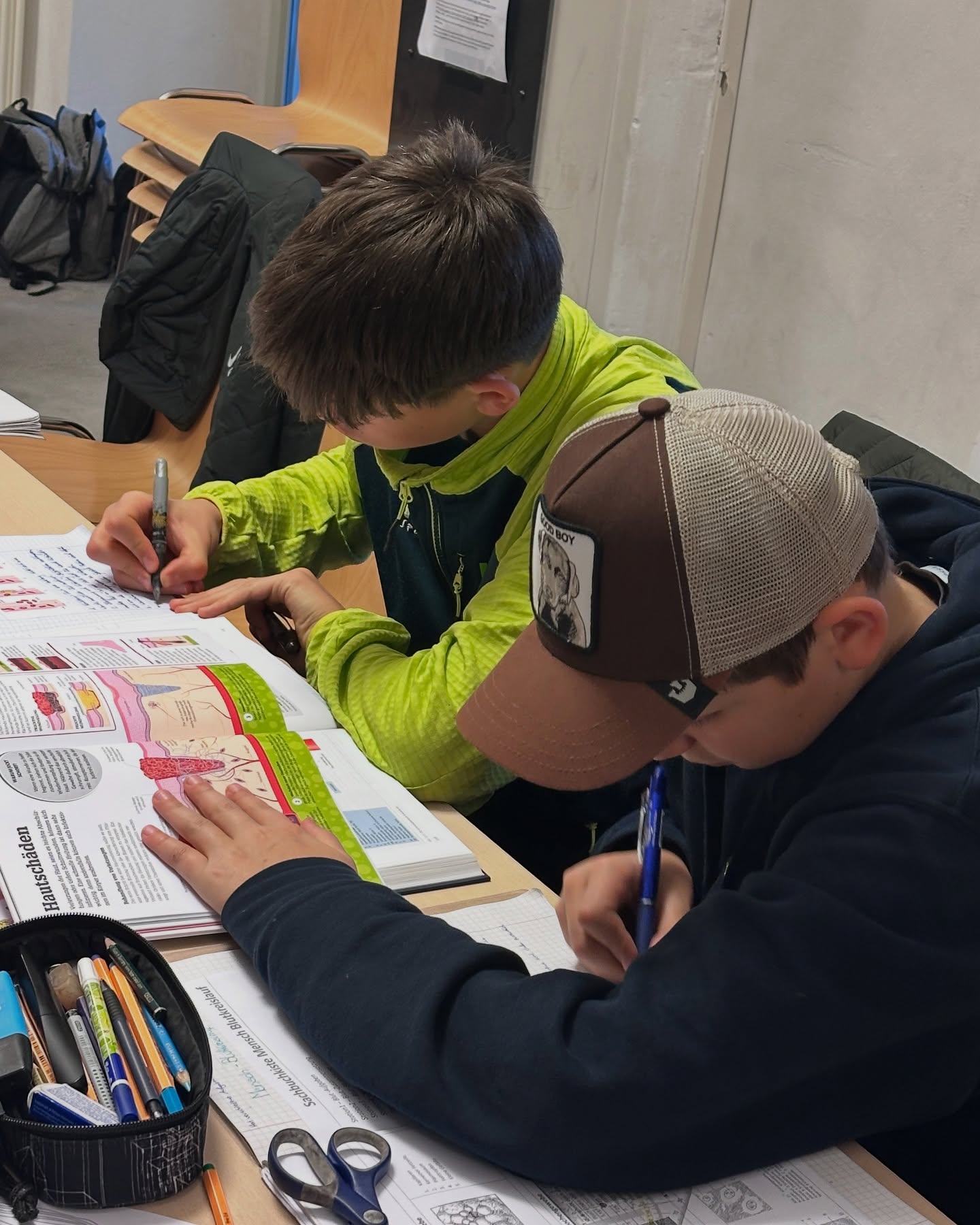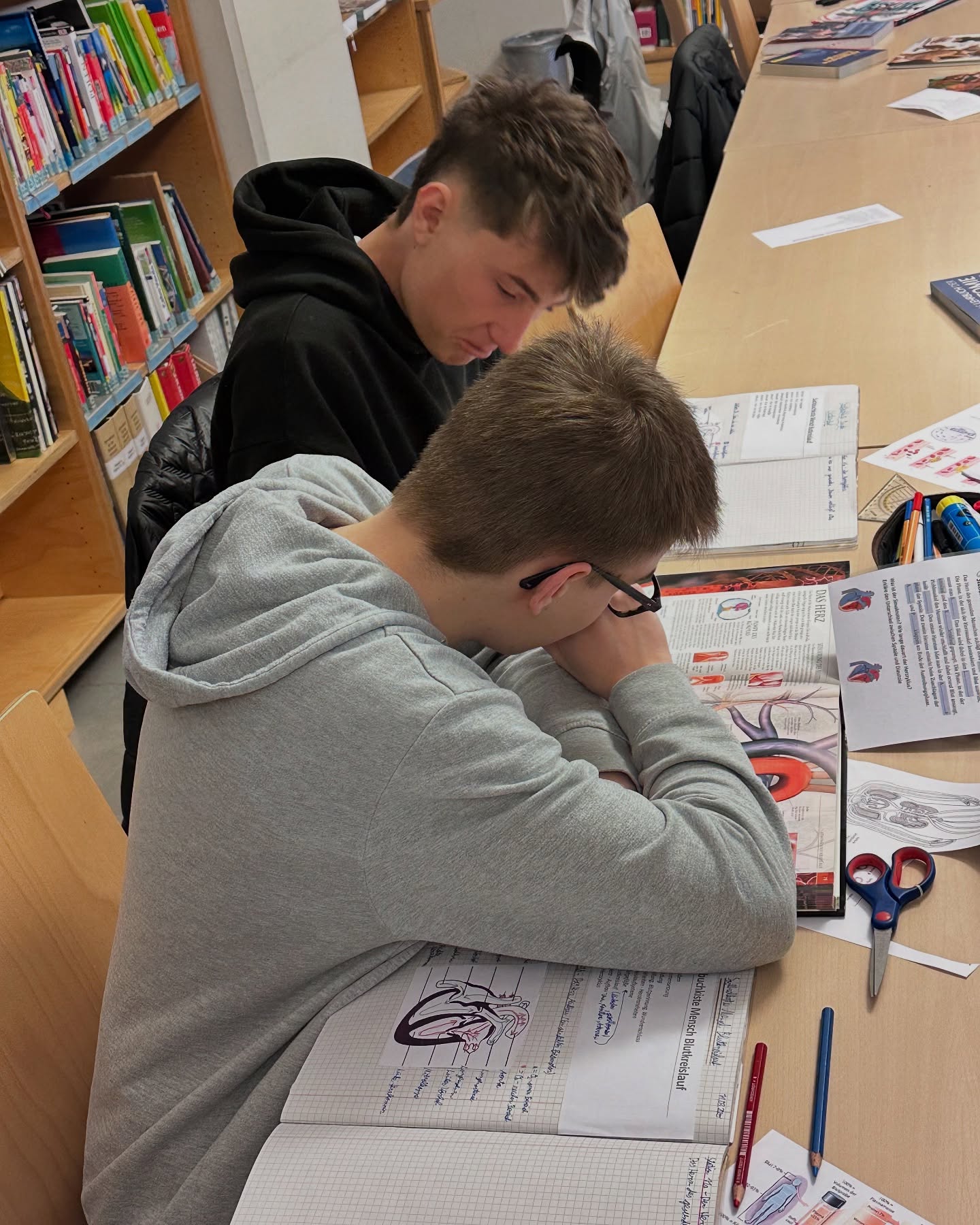 Die Schülerinnen und Schüler der Klasse 2C erarbeiten sich wichtige Fakten zum Thema Blut und Blutkreislauf aus verschiedenen Fachbüchern. Das Nachschlagen in Büchern will gelernt und trainiert werden. Die Biologielehrerin Prof. Verena Mayr hat hierfür eine Sachbuchkiste mit geeigneten Medien zusammengestellt.