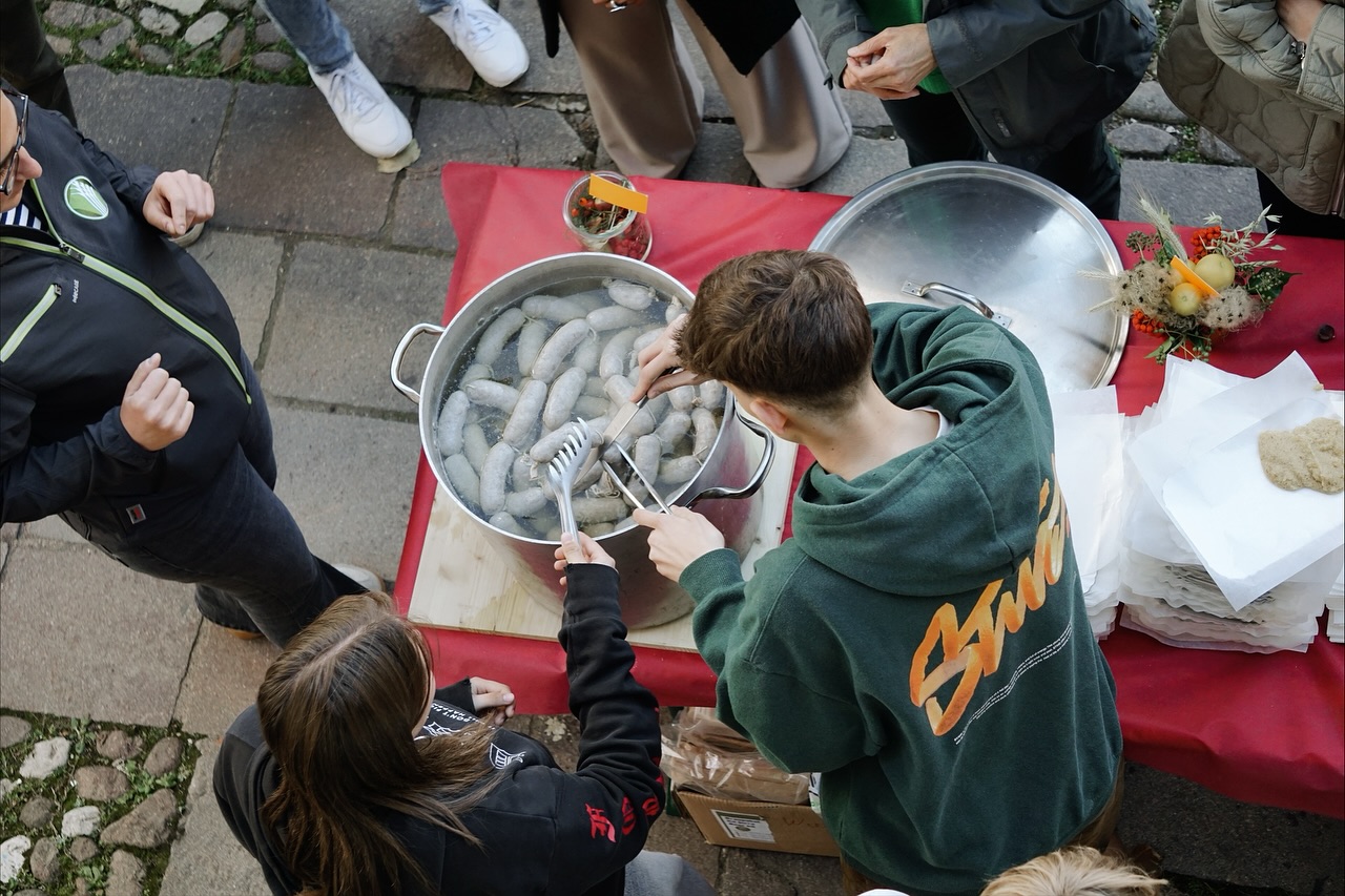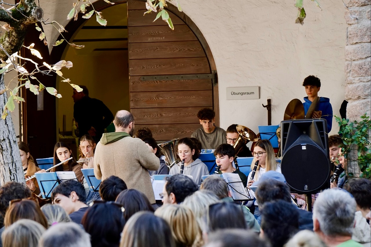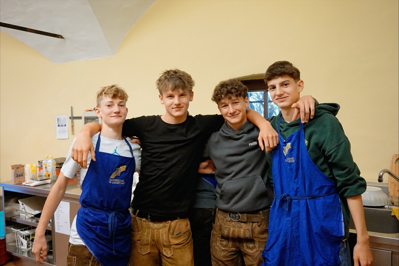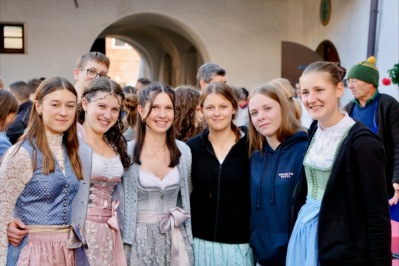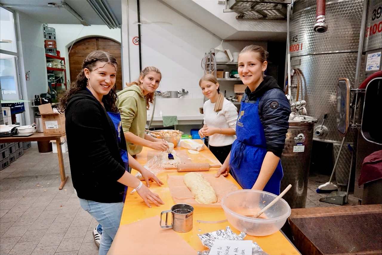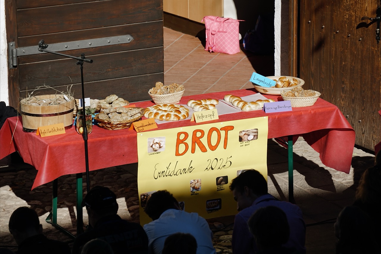 Bei strahlend blauem Himmel feierte die OFL am Freitag, den 24. Oktober, ihr 23. Erntedankfest. Für die Schüler:innen der 2. Klassen war das eine willkommene Abwechslung. In verschiedenen Gruppen wurden Krapfen gebacken, Wurst mit Plent zubereitet, Käse- und Apfelgerichte angeboten, Knödel und Suppen gekocht, frisches Brot gebacken und feine Kastanienköstlichkeiten serviert. Auch eine eigene Dekogruppe war mit viel Kreativität und Liebe zum Detail im Einsatz. Sie schmückte den Innenhof und sorgte so für eine stimmungsvolle Atmosphäre.